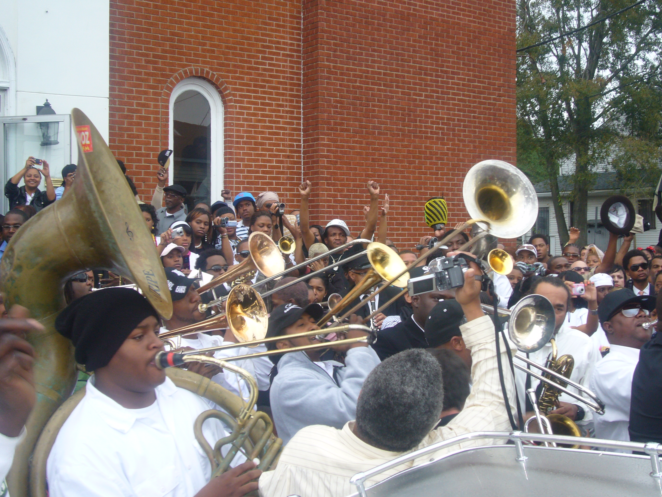 In the traditional jazz funeral, a prominent member of the community—often a musician and nearly always a black male—is “buried with music.” Benevolent and burial societies traditionally arrange these funerals, often offering the services of a brass band for an extra fee. The societies collect dues throughout the year to pay for members’ health care and burial costs. The musicians, funeral directors, family, and friends of the dead make up what is called the first or main line, while the crowd marching behind is collectively known as the second line. As the procession moves from the funeral service to the burial site, the first and second lines march to the beat of a brass band. At the beginning, the band plays dirges, somber Christian hymns performed at a slow walking tempo. After the body is laid to rest, or “cut loose,” the band starts playing up-tempo music, the second liners begin dancing, and the funeral transforms into a street celebration.